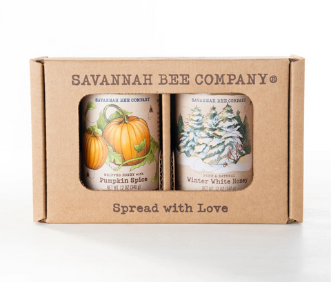 Whipped honey duoPumpkin Spice whipped honey is whipped wildflower honey with a signature blend of cinnamon, nutmeg, ginger, and allspice. Winter White honey is frosted, spreadable and as sweet as a first snowfall. Light and smooth texture and sweet like candy, this honey melts effortlessly into a subtle, sugary velvetiness.