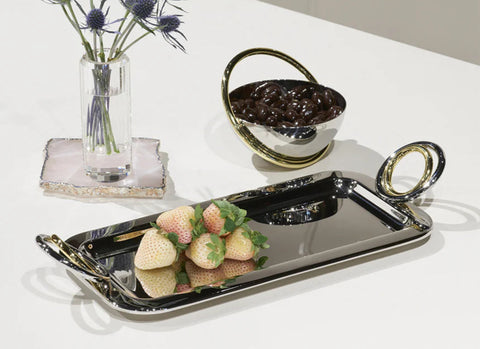 Crafted from stainless steel and solid brass, this versatile design is equally comfortable as a carrier of a trio of nut and candy bowls, or even a display of hors d’oeuvres or crudite.