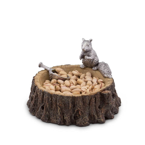 |  | Squirrel nut bowlAn exquisite, aluminum squirrel balances on the edge of this piece as he watches over his treasured collection of nuts. Realistically crafted in resin, the stump-like stand features an intricate exterior of figural bark, while the interior takes on a lighter, wooden color. The bowl also includes an aluminum, nut-shaped scoop.