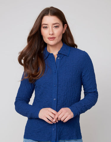 Royal blue textured knit button and collared shirt with long sleevesĀ