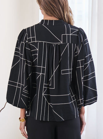 Black with white detailing tunic has a stand up collar, split neck and 3/4 puffed sleeves